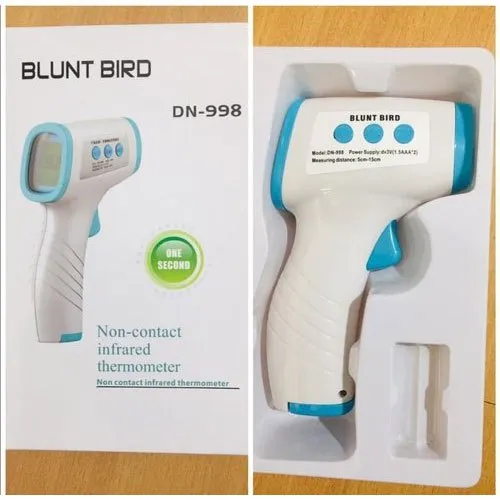 Termômetro clínico infravermelho para corpo humano sem contato. Usado para medição de temperatura do corpo humano entre 32°C a 42,9°C a uma distância de 5 cm até 15 cm. Possui display em LCD com a indicação numérica da temperatura medida, alarme visual, pela mudança de cor do display, e audível quando a temperatura medida excede os limites programados.